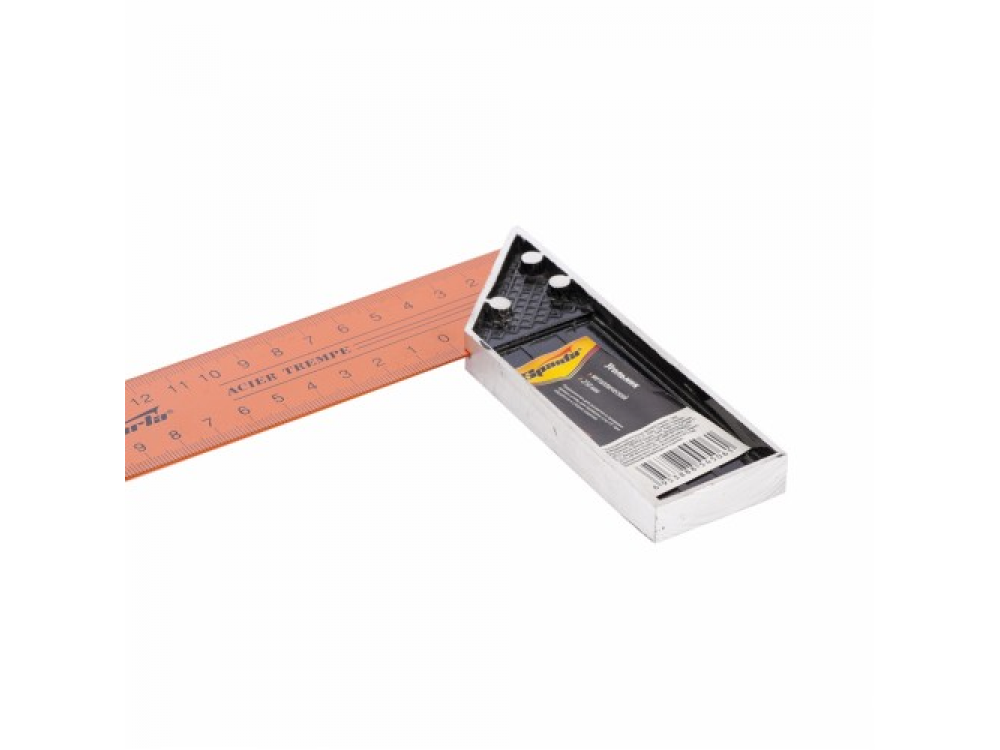 Металлический угольник с окрашенной поверхностью и двухсторонней разметкой полотна. Полотно угольника имеет двухстороннюю разметку. Предназначен для разметки и проверки прямых углов, а также для проверки угла 45 градусов при обработке и сборке изделий.