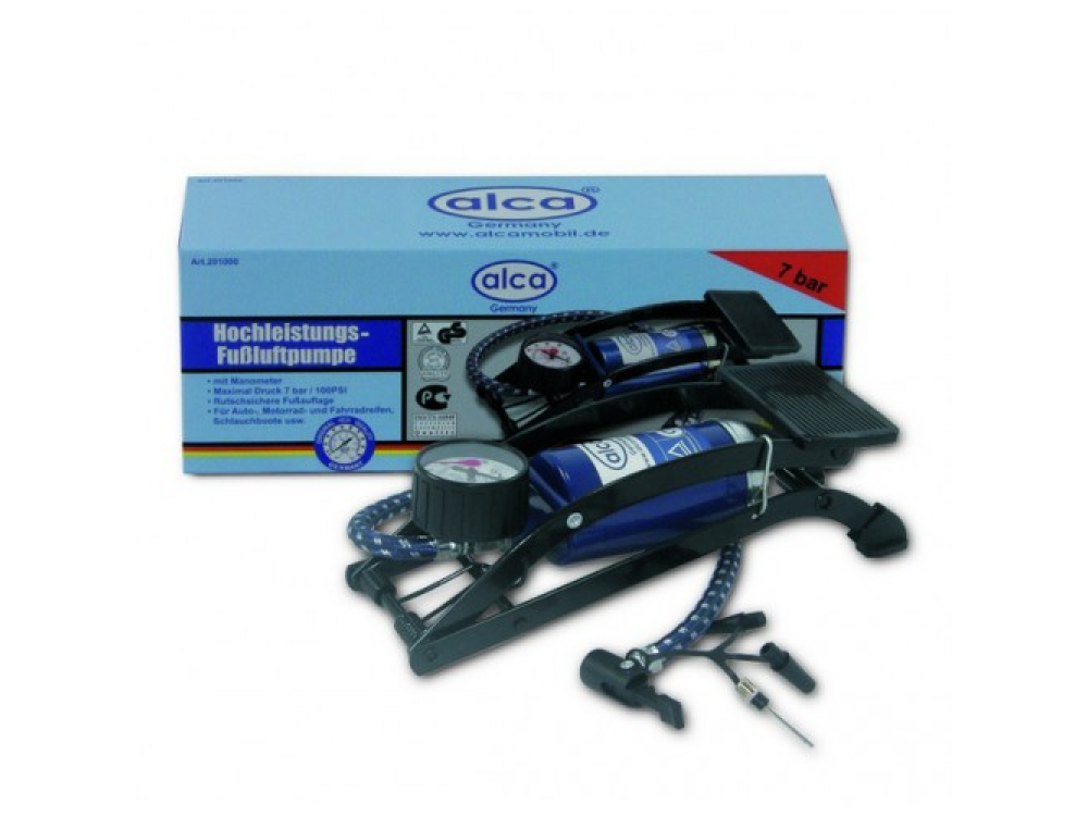 Насос ножной один цилиндр 7 бар, с манометром,шланг 45 см., 4 адаптера для накачки шин автомобилей, мячей, велосипедов и т.д.