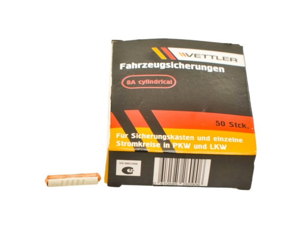 Главная / Автотовары / Электрооборудование / Ремонт электрики / Предохранители / Предохранитель 8А цилиндрический VETTLER