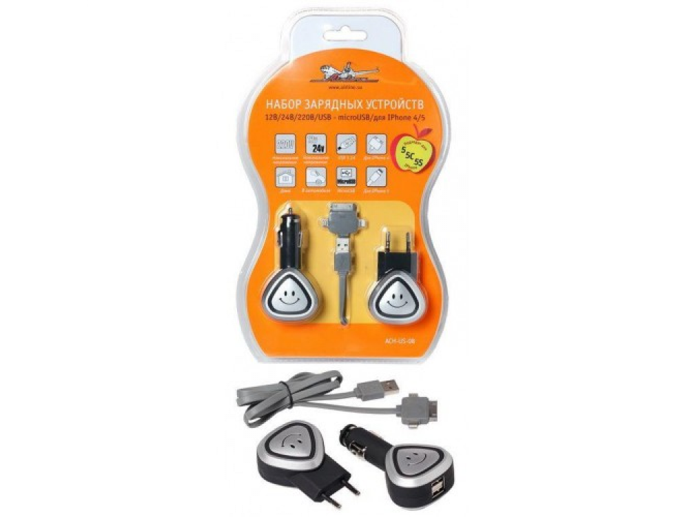 Комплект портативных адаптеров от AIRLINE разработан для подключения техники с портом типа microUSB, а также мобильных телефонов IPhone 4, 5, 5C и 5S. В набор входят адаптеры с различным уровнем производимого тока, а также различными способами подключения к сети электропитания – от машинного прикуривателя и с помощью стандартной вилки. Приятным бонусом является современный дизайн изделия, для которого использованы современные принты для украшения адаптера. Набор состоит из адаптера 220В (в розетку) – USB 1A, адаптера 12В/24В (в прикуриватель) – 2USB 3,1А и кабеля USB - microUSB/для Iphone 4/5. Предназначен для питания и зарядки различных мобильных устройств с интерфейсом microUSB и Iphone 4/5 от гнезда прикуривателя автомобиля и от розетки 220В.Кабель можно использовать не только для зарядки, но и для синхронизации устройств с компьютером. Он выполнен из мягкой, высококачественной резины. Корпус адаптеров имеет стильное прорезиненное покрытие. Преимущества:УниверсальностьВысокое качество материаловСтильный дизайн ACH-US-08